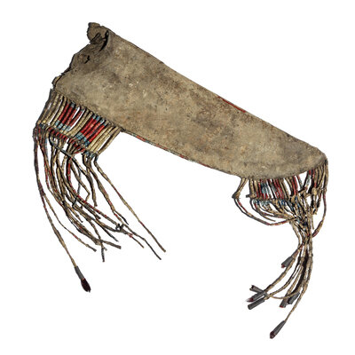 thick, soft hide decorated with remnants of red, blue, and cream quillwork; quilled hide slats finish with fringe and tin cones; rawhide liner