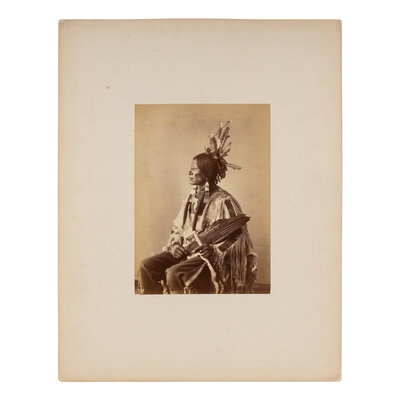 7 1/4 x 5 1/4 in. albumen photograph on 14 x 10 3/4 in. cardstock mount. With Jackson catalog number 733 written in negative. Taken 20 September 1872 during a delegation trip to Washington, DC. Many Horns holds an ivory-head cane said to have been given to him by Lincoln.
