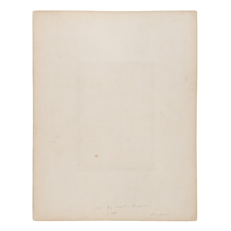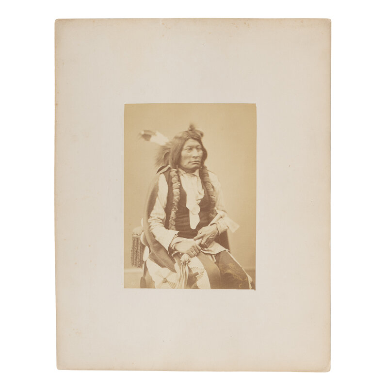 7 1/4 x 5 1/4 in. albumen photograph on 14 x 10 3/4 in. mount. Although uncredited, the photograph is attributed to Alexander Gardner, and was likely taken while Big Mount was on a delegation in Washington, DC, ca 1872. The subject wears a peace medal and holds a pipe-tomahawk.