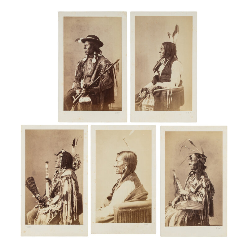 "Walking Shooter" or "Wa-Ku'-Ta-A-Ma'-Ni," Hunkpapa Lakota Sioux, numbered in pencil at lower right "267." -- "Bears Nose" or "Ma-To-Pa-Ge," Cut Head Sioux, numbered in pencil at lower right "287." -- "Skin of the Heart," or "Shanta-Ya," Cut Head Sioux, numbered in pencil at lower right "289." -- "Two Bears" or "Ma-To-No-Pah," Lakota Sioux, numbered in pencil at lower left "281." -- "Charge on the Hawk" or "Hawk-Tske-Tan-Vua-Tak-Pah," Brule Sioux, numbered in pencil at lower right "346."