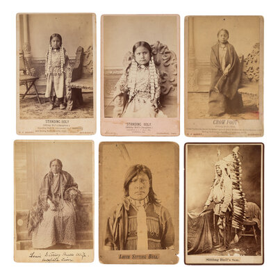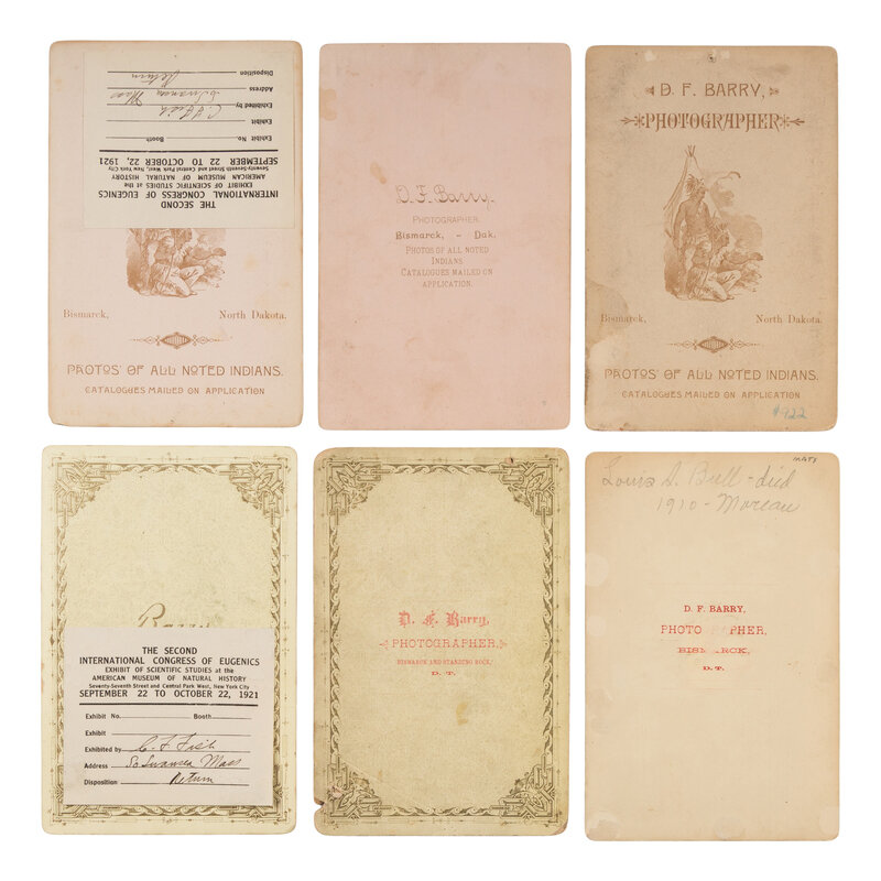 six cabinet cards by D.F. Barry, each with his Bismarck and/or Standing Rock, Dakota Territory imprint on mount recto and/or verso. Two versos with pasted label from the "Second International Congress of Eugenics Exhibit of Scientific Studies," held at the American Museum of Natural History in the fall of 1921, with an ownership record of C.F. Fish of South Swansea, Massachusetts.