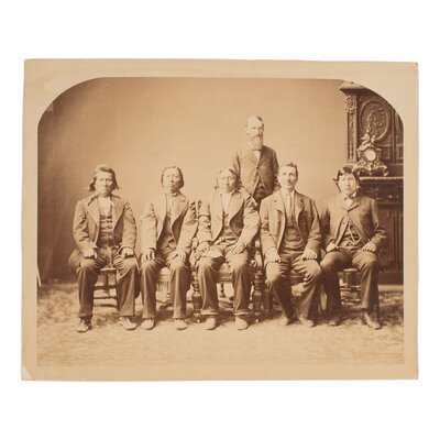 16 x 20 in. albumen photograph (including margins) on cardstock mount. A studio portrait of six men believed to represent the Sisseton Yanktonai delegation in Washington, DC, in 1880. Photographer unknown.