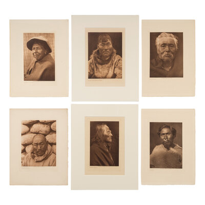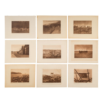 12 volume photogravures on Japon vellum: Calling a Moose, Cree. -- Walrus Boats, Big Domede in the Distance. -- Start of Whale Hunting, Cape Prince of Wales. -- Oksiwik, Cape Prince of Wales. -- Tamlaitk, Namnit. -- Herring Racks, Nunivak. -- Kaiak Frame, Nunivak. -- Chahali, Nunivak. -- Kaiak With Seal Hunting Equipment, Nunivak. -- A Partially Cut Up Whale. -- A Mamalelekala Chief’s Mortuary House. -- Henipsum Village, Cowichan.