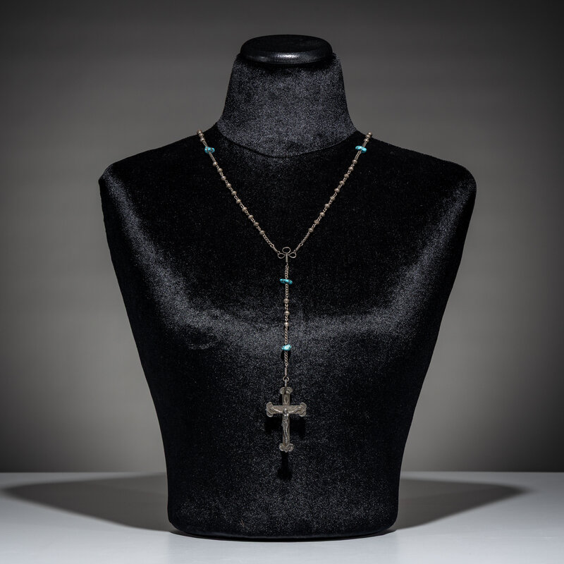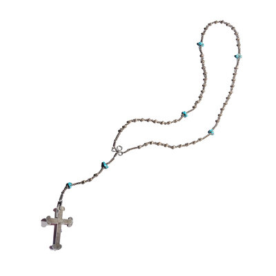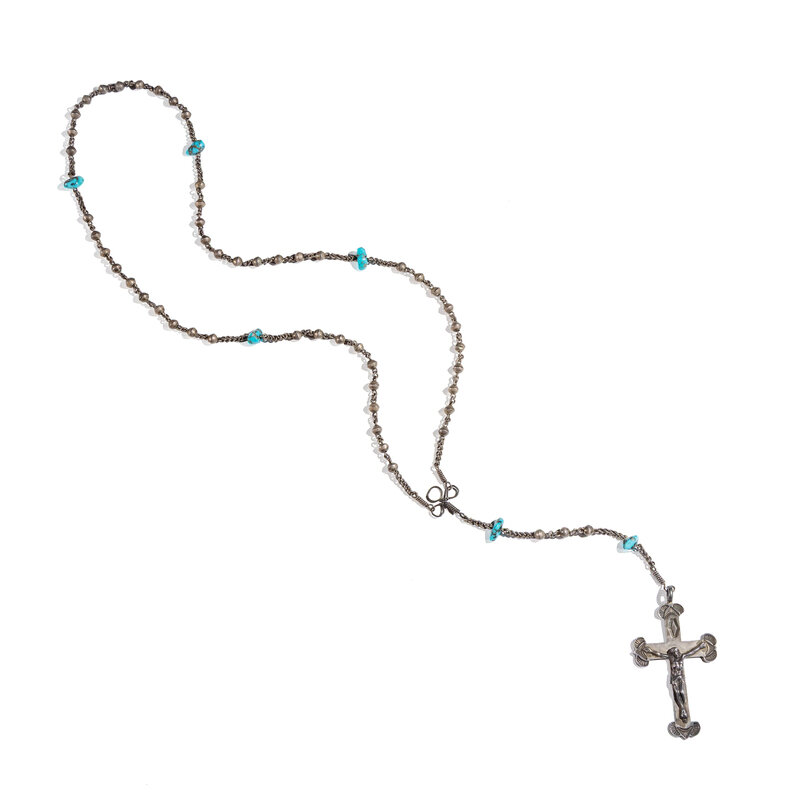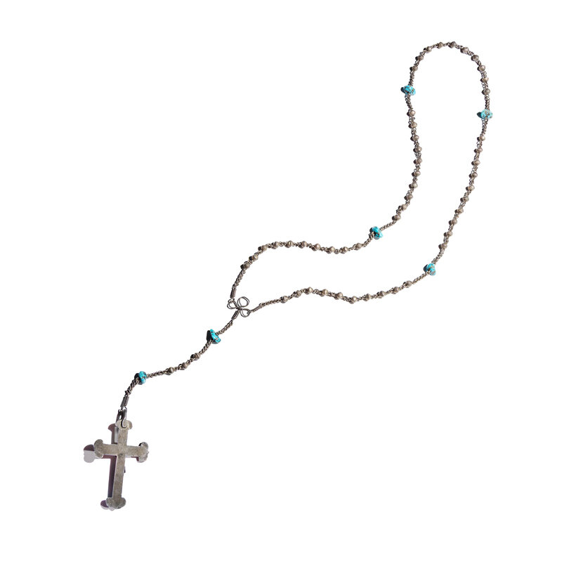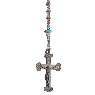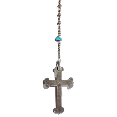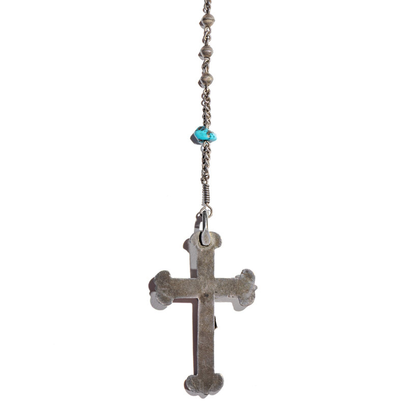 stamped cross pendant attached to a handmade chain decorated with handmade beads, filigree, and turquoise nuggets