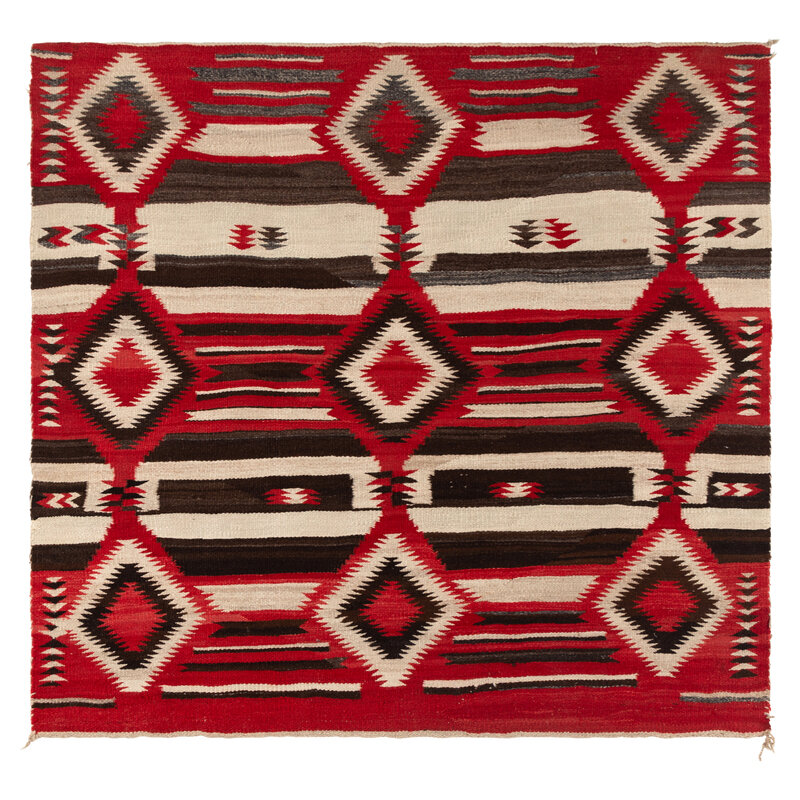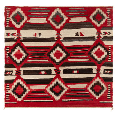 handspun wool woven in colors of red, cream, fugitive purple, and dark brown; banded design with serrated diamonds