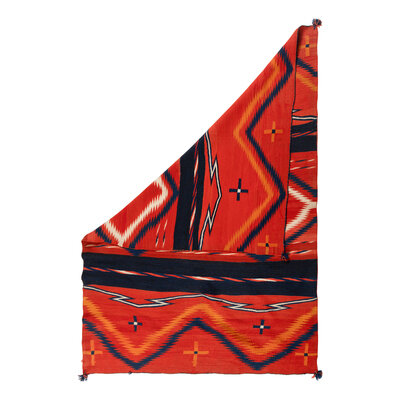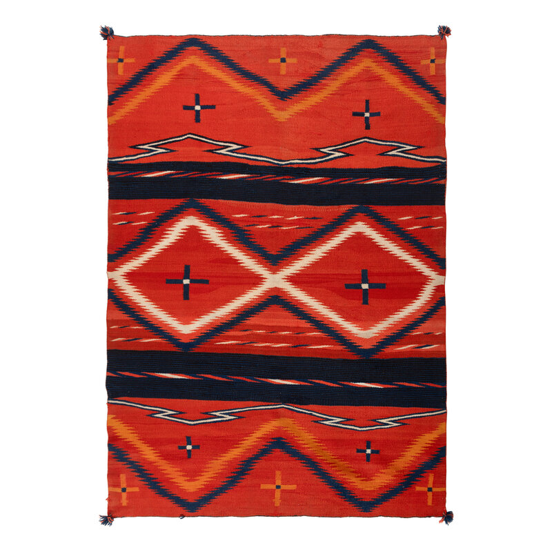 handspun wool woven in red, indigo, cream, and orange; serrated diamonds with Moki-style bands; corner tassels