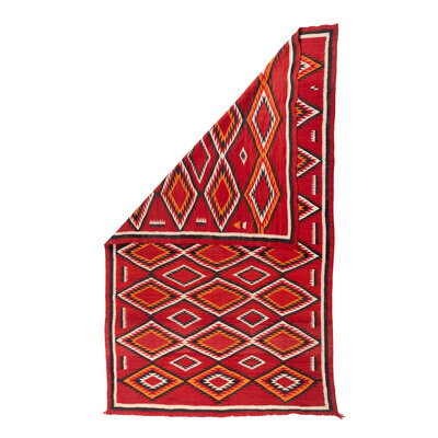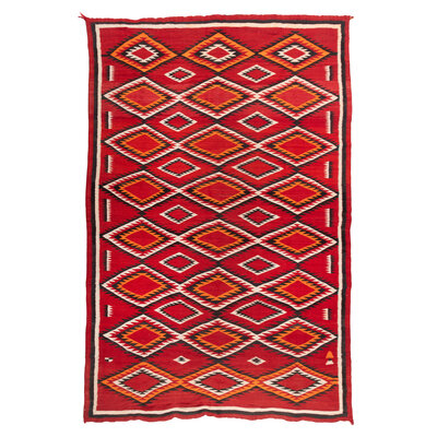 featuring bands of serrated diamonds woven in colors of red, orange, cream, and brown