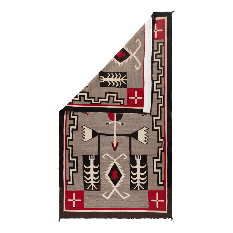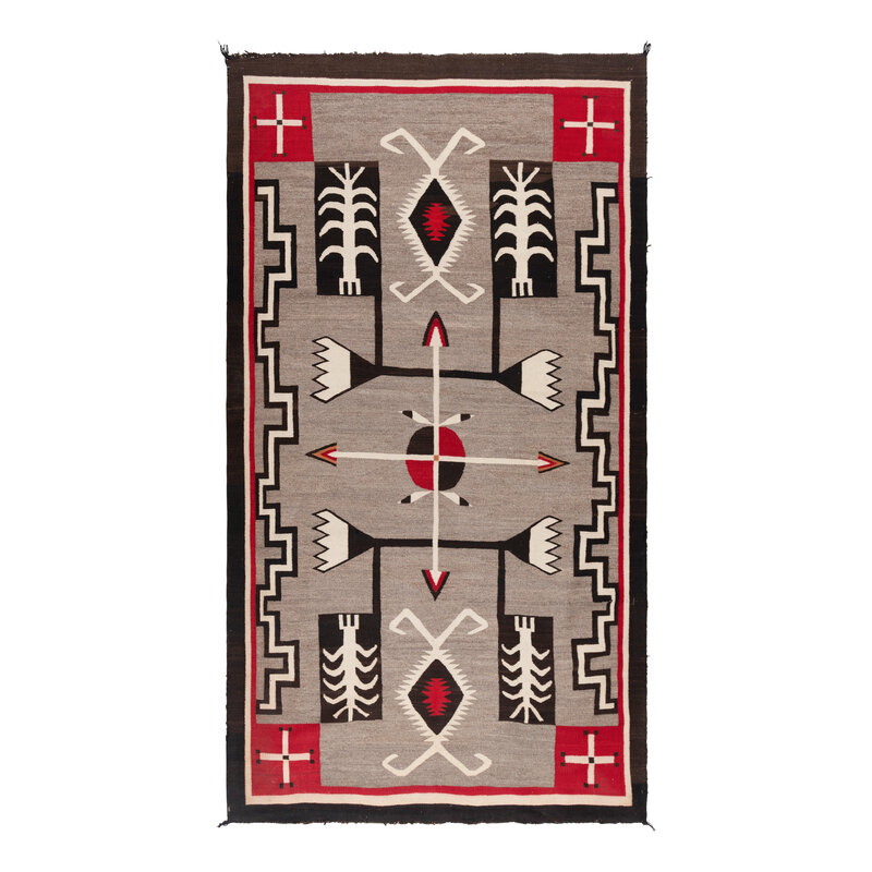 fine, flat weave woven of handspun wool in colors of gray, dark brown, red, and cream; designed with cornstalks, waterbugs, eagle wings, and Spider Woman crosses