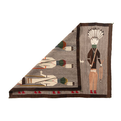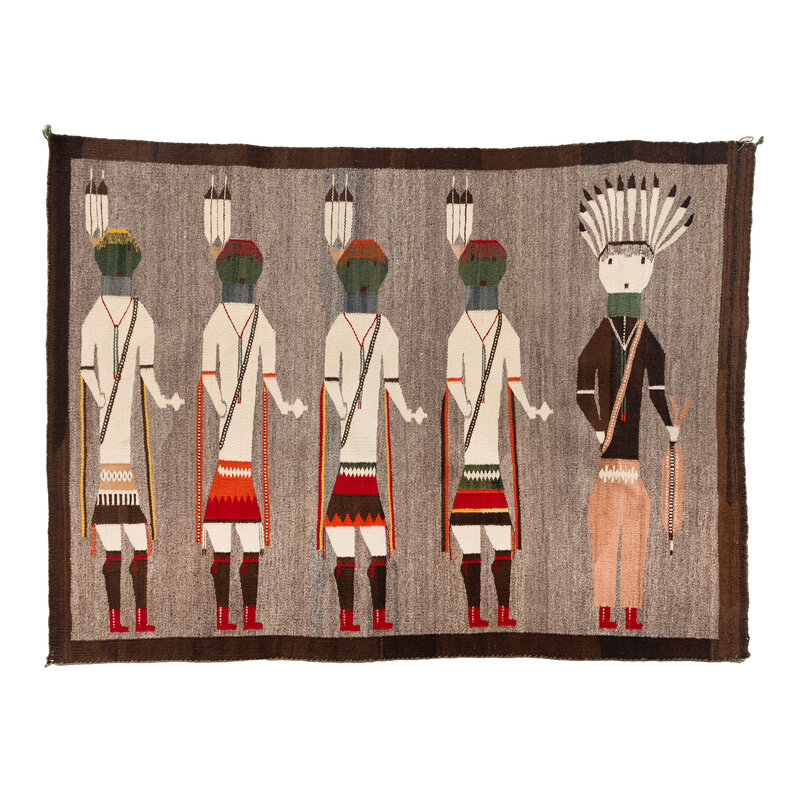 fine, flat weave woven with handspun wool in colors of green, orange, red, browns, and cream, designed with four Yei and Water Sprinkler