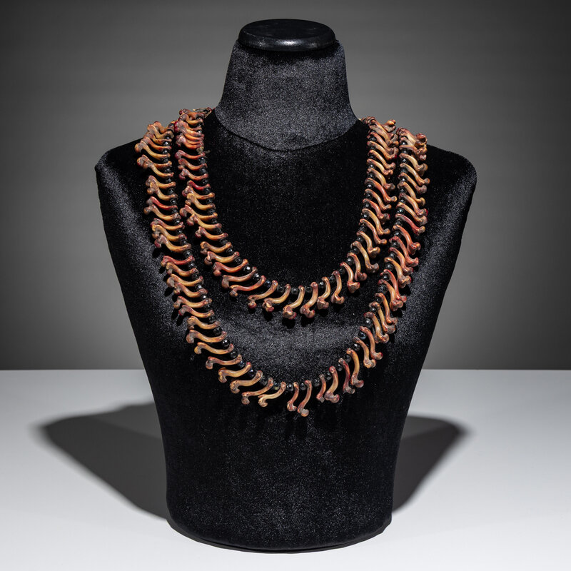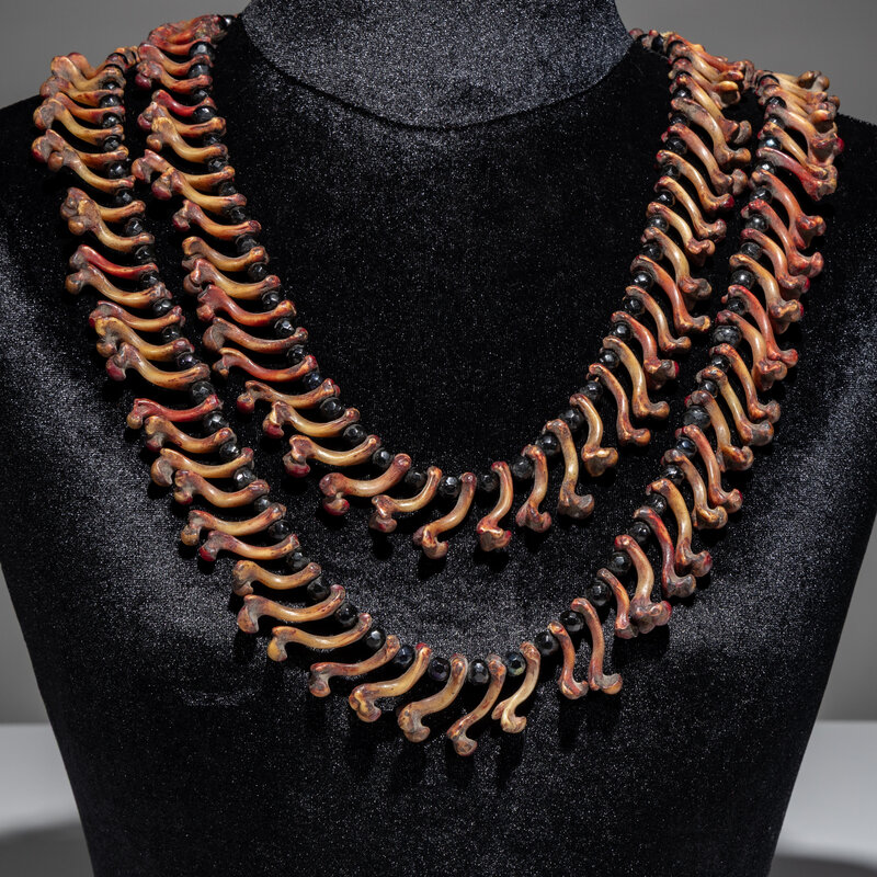 approximately 157 turtle bones separated by faceted black beads are strung onto cotton thread; red pigment on bones, overall length 34 inches