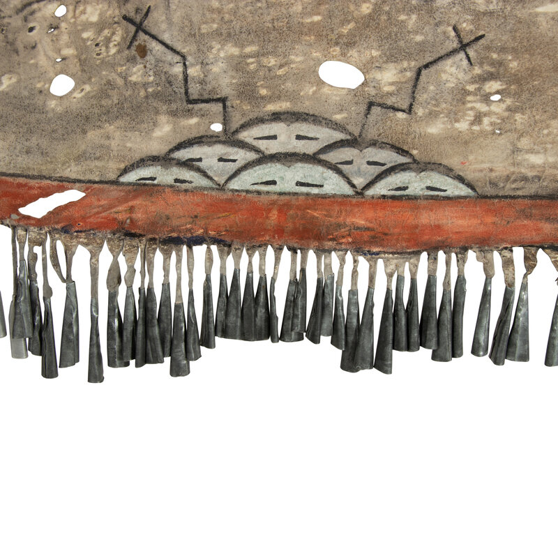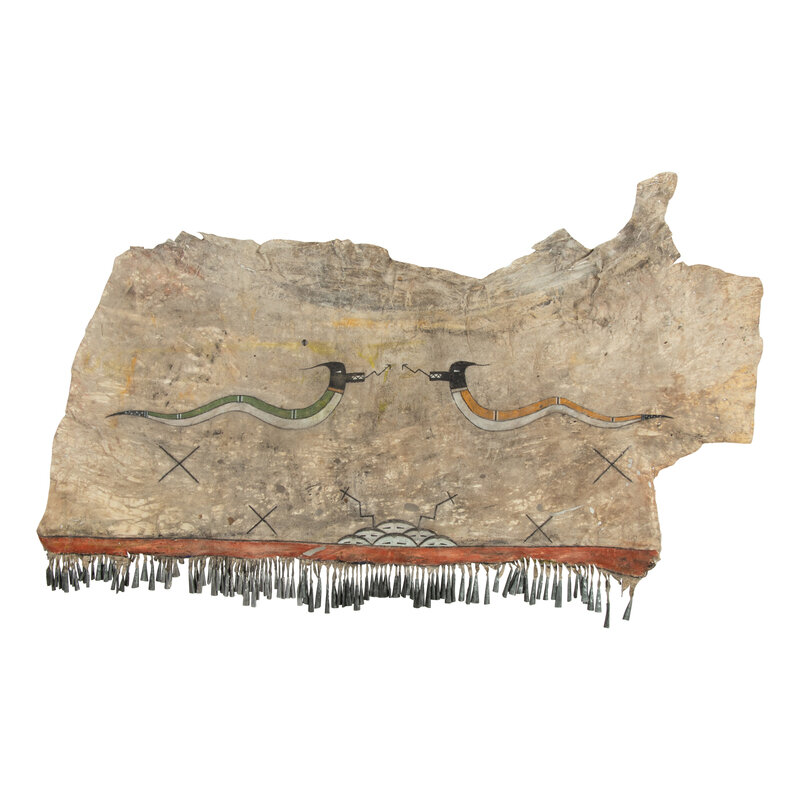 painted with two facing Avanyu above an active rain cloud; a red band is painted along the lower hem and finished with tin cone fringe