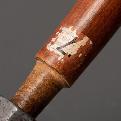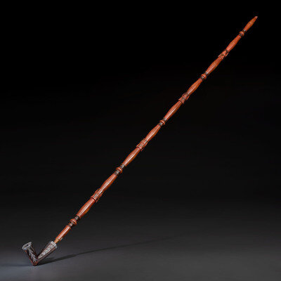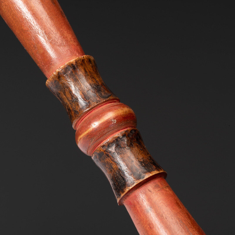 The stem, gracefully carved, is composed of nine cylindrical segments with deeply carved triangular elements (possibly representative of Thunderbirds), divided by a sequence of nine sculpted, convex spool-form “beads,” painted in red and black pigments; length 45-1/2 inches