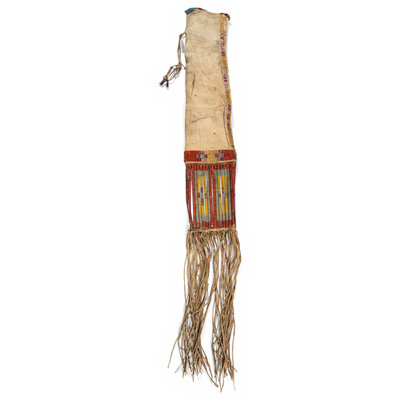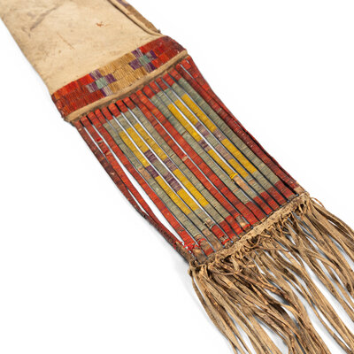 sinew-sewn, softly-tanned hide; with a lane of purple, yellow, and cream quillwork along the throat; three lanes create the bottom panel; quilled rawhide slats