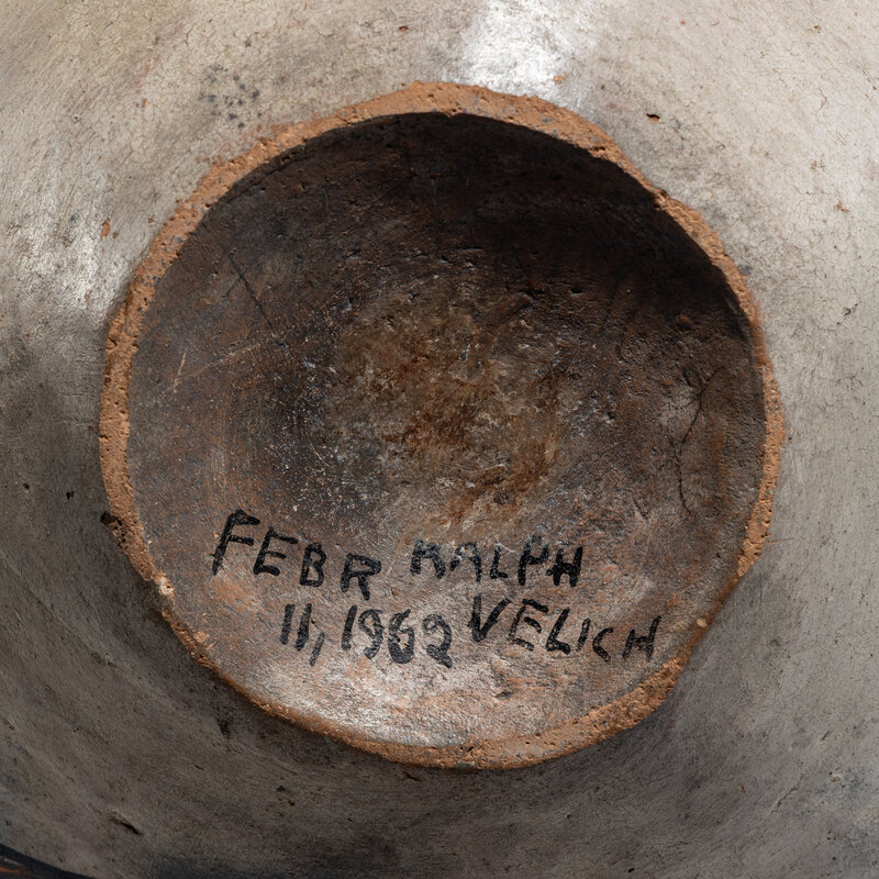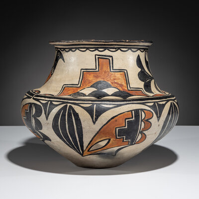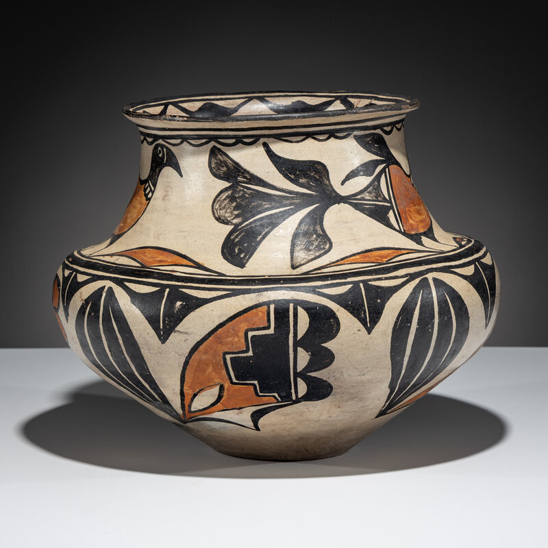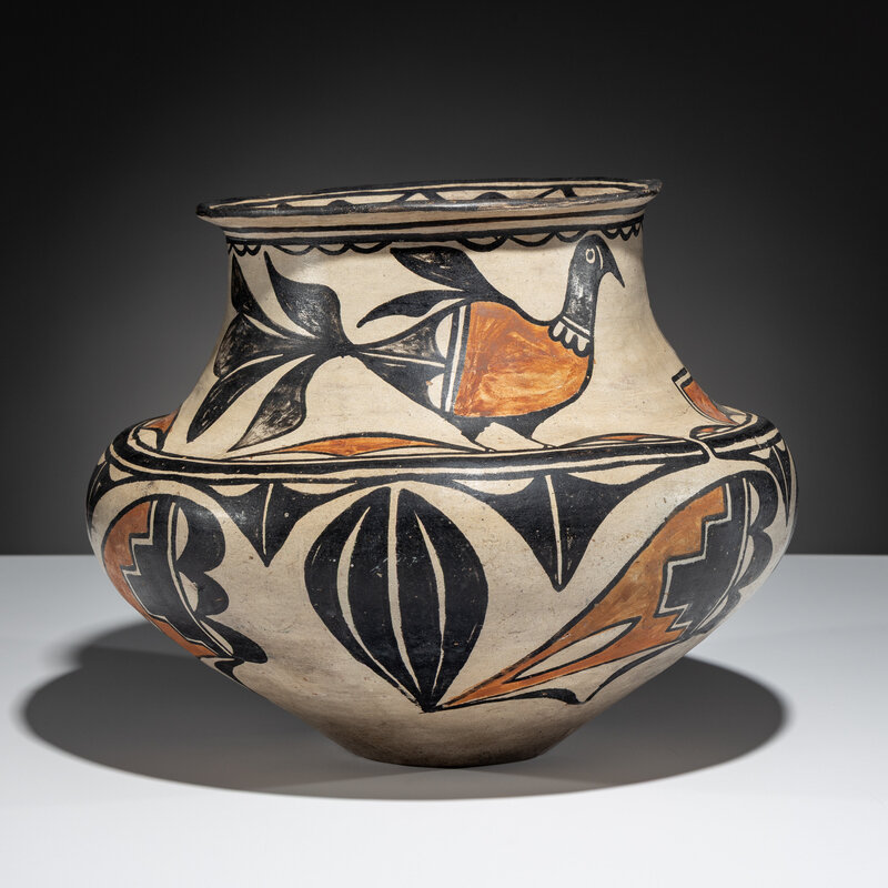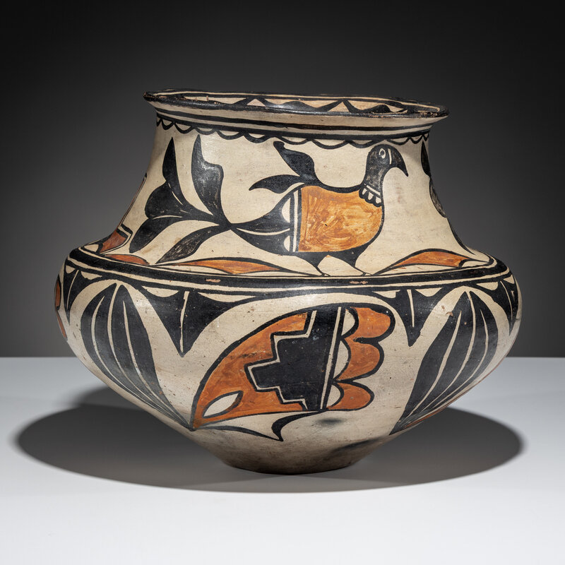 concave base; neck designed with two large birds and body with foliates and winged elements