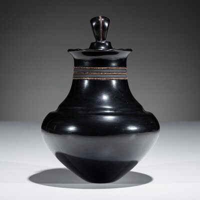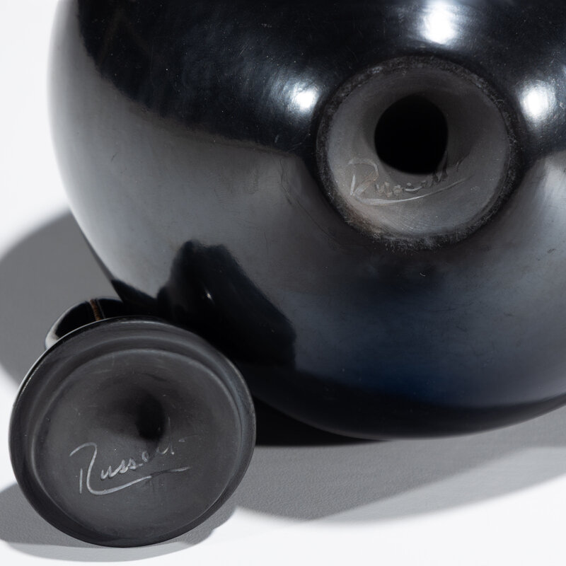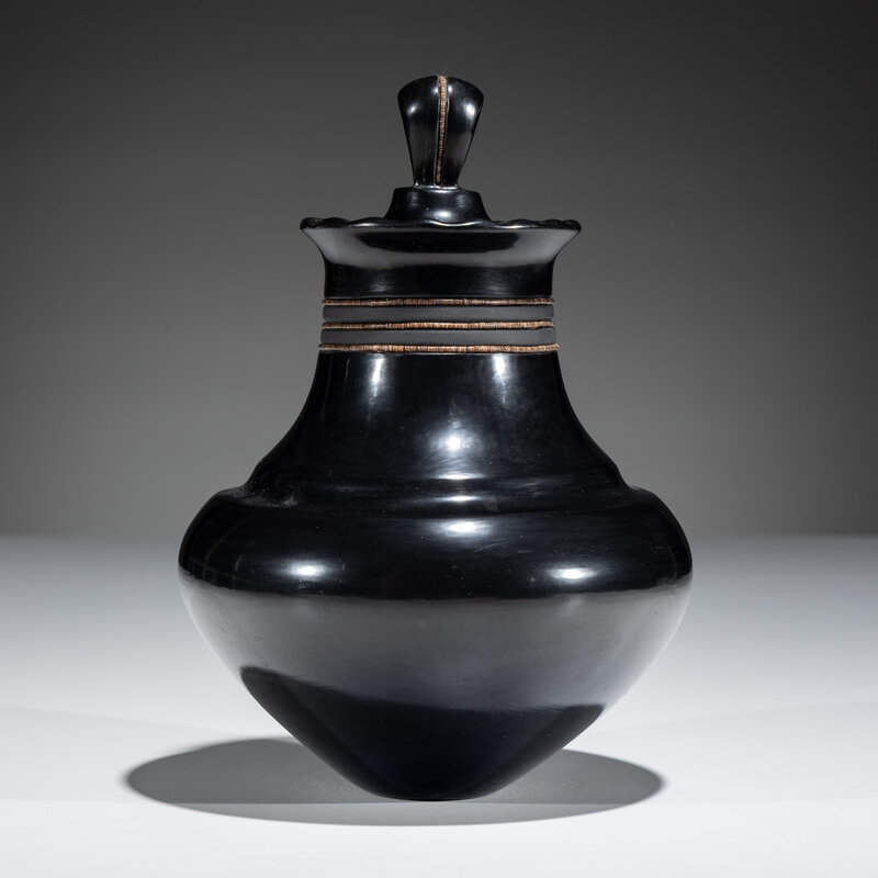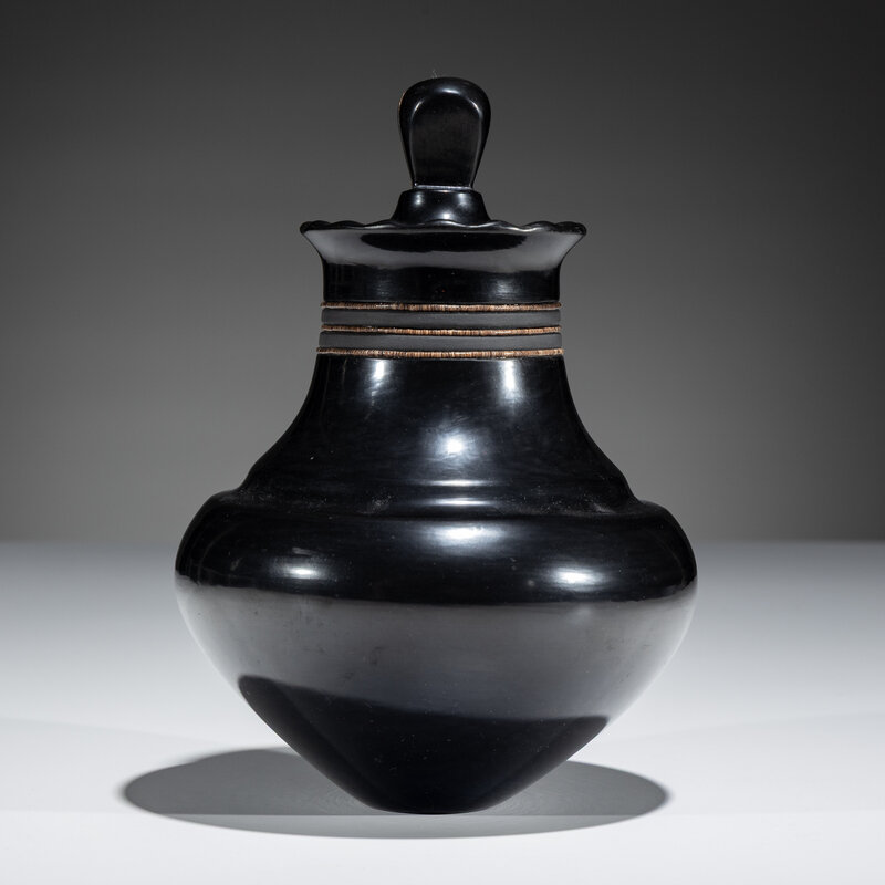 having a squash blossom form; body with three strands of heishi; lid embellished with a single strand; lid and body both signed