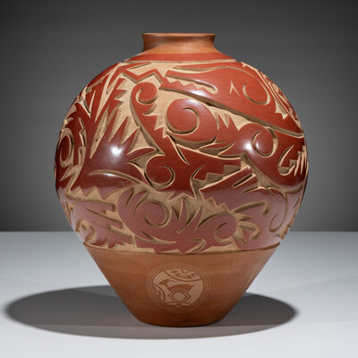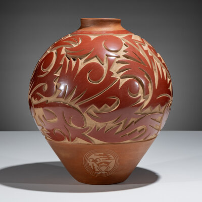 Large Three-Toned Deeply Carved Pottery Jar, 1992