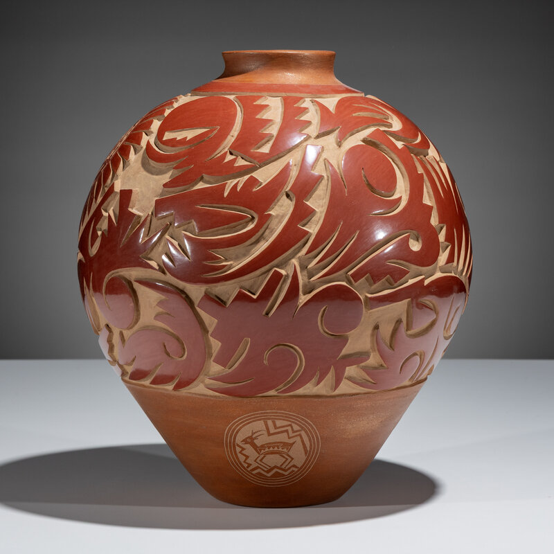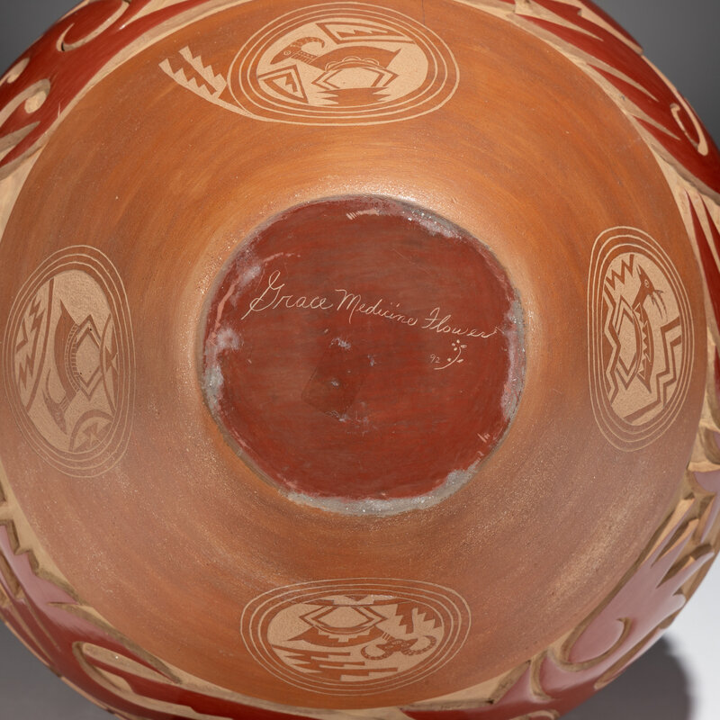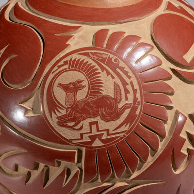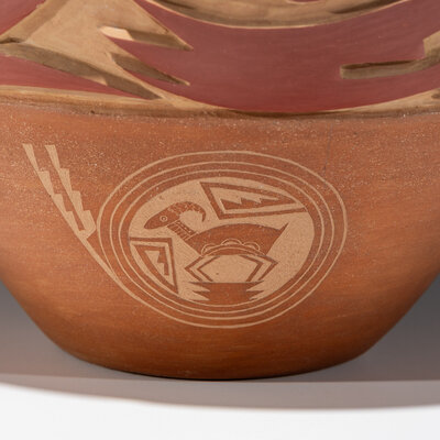 decorated with a deeply carved Avanyu along with winged and geometric elements; further embellished with sgraffito medallions depicting deer; signed and dated on the base