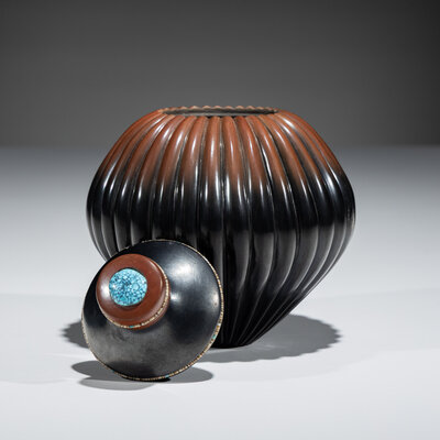 having 32 ribs; lid detailed with two strands of heishi and topped with an Indian Mountain Turquoise cabochon; cosigned on base, lid signed Russell