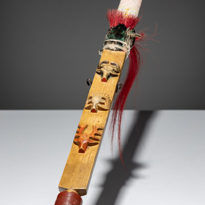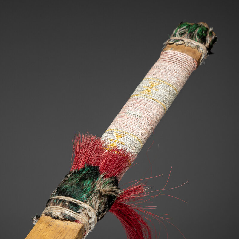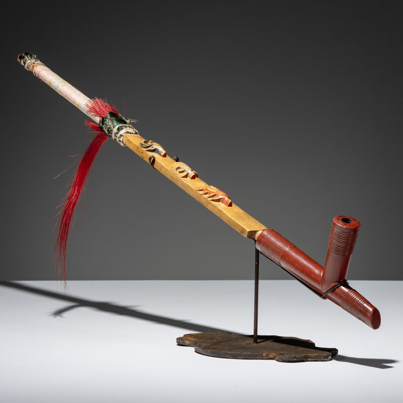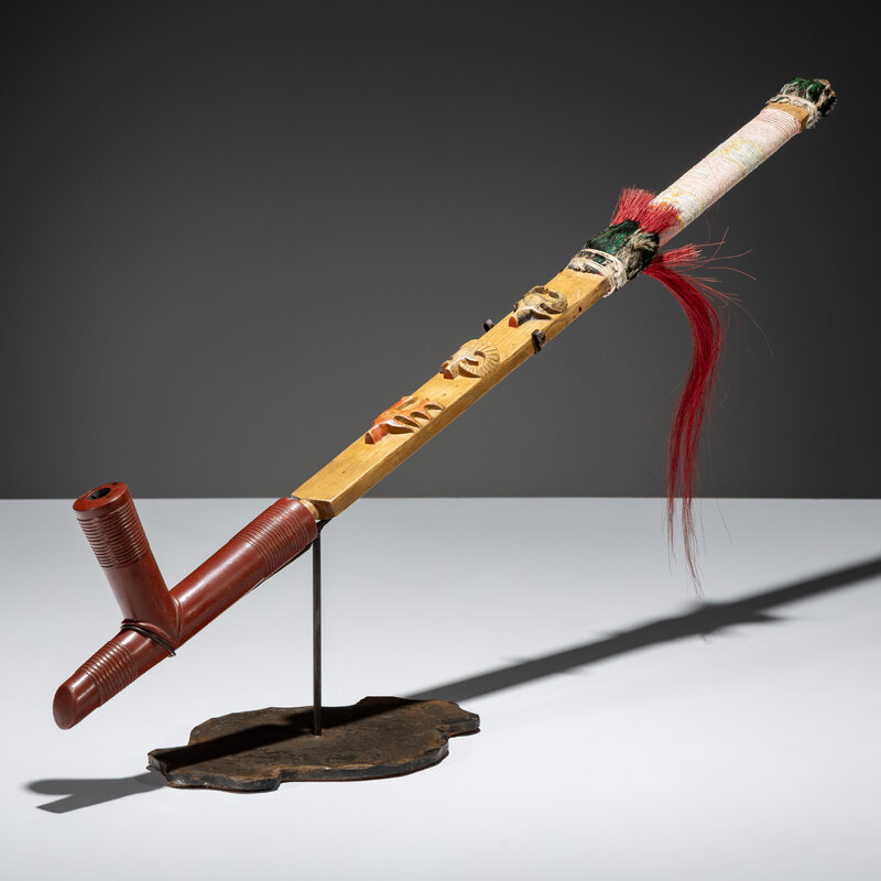 the stem features a buffalo, ram, and elk head carved in relief; further embellished with quilled wrapping; T-shaped catlinite bowl carved with concentric rings