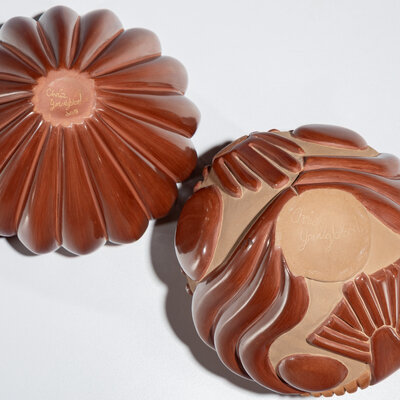 a lidded jar by Nancy Youngblood; 16 ribs on body; signed and dated 2019 on base, height 7 inches x diameter 4-1/2 inches