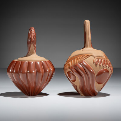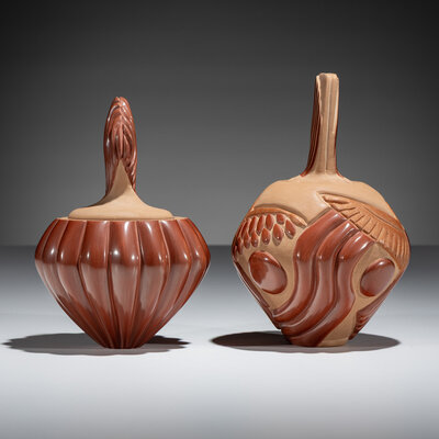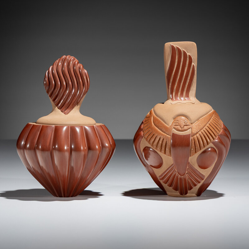 a lidded jar by Chris Youngblood; decorated with micaceous parrots; signed on base, height 8 inches x diameter 4-1/2 inches