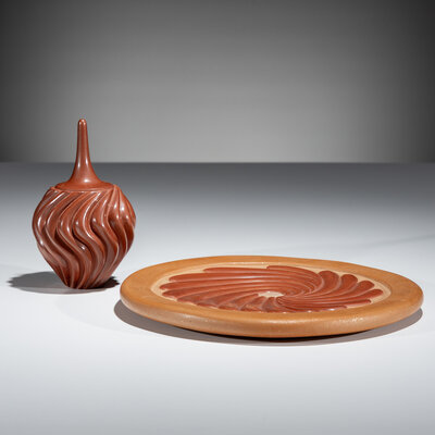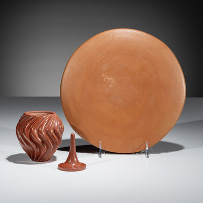 Carved Redware Pottery Plate and Vase