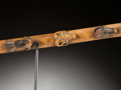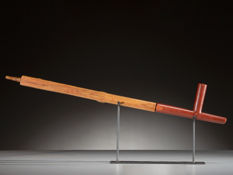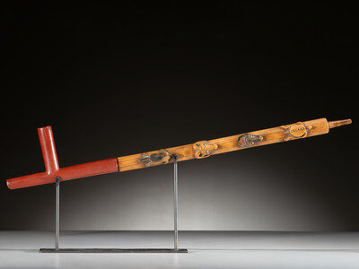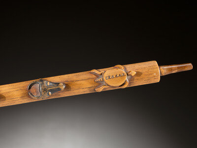 lightly pigmented stem carved with a turtle, buffalo, sheep, and beaver; T-shaped catlinite bowl
