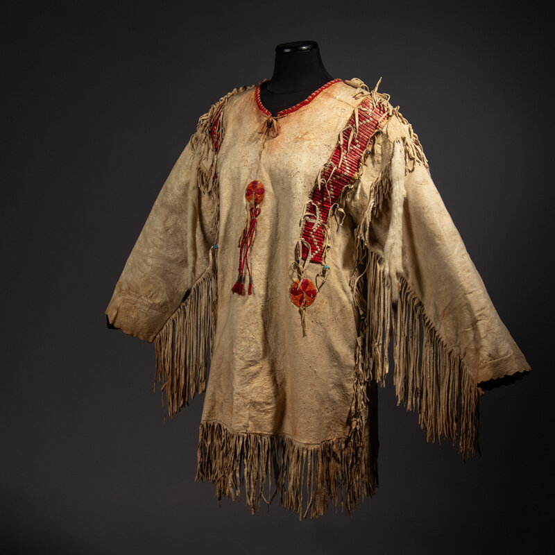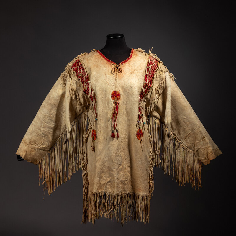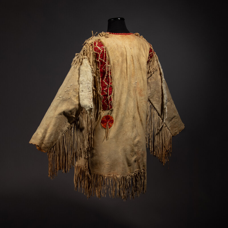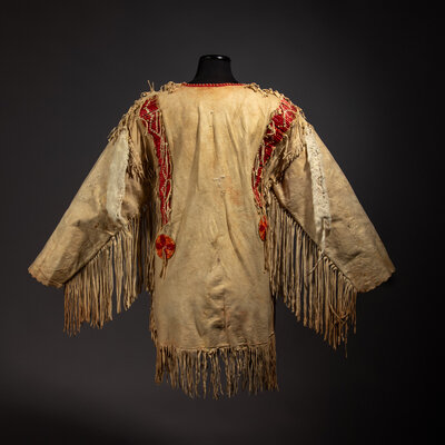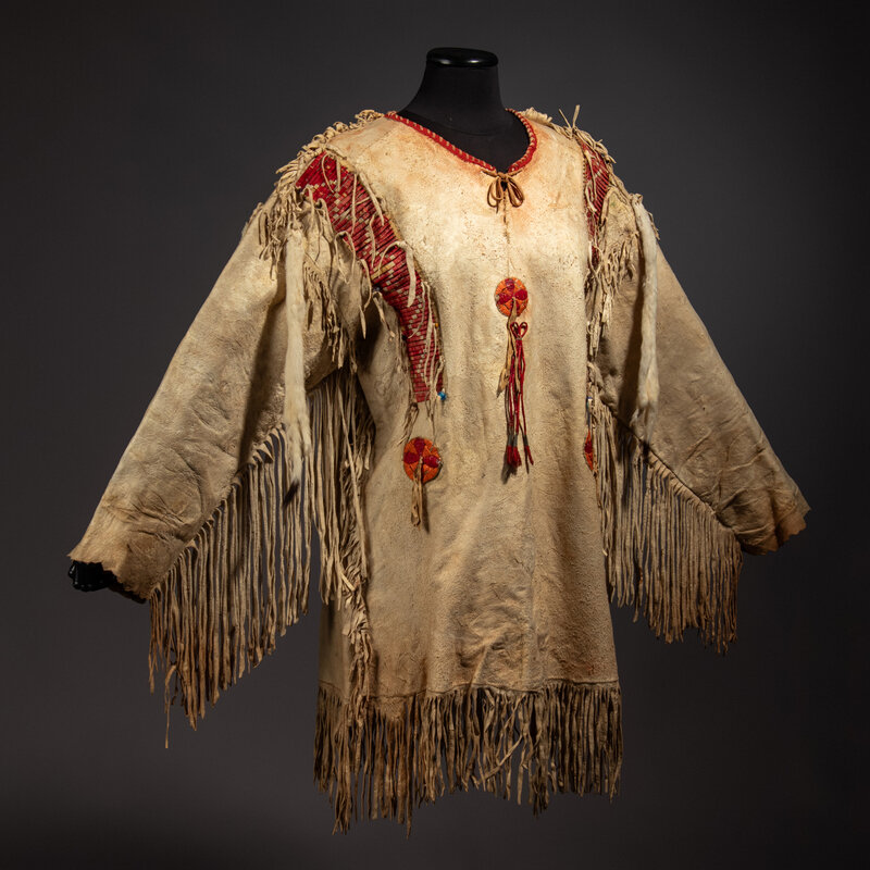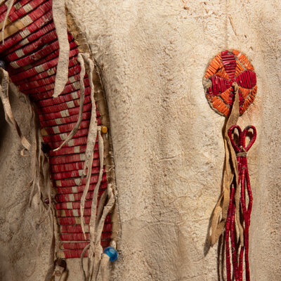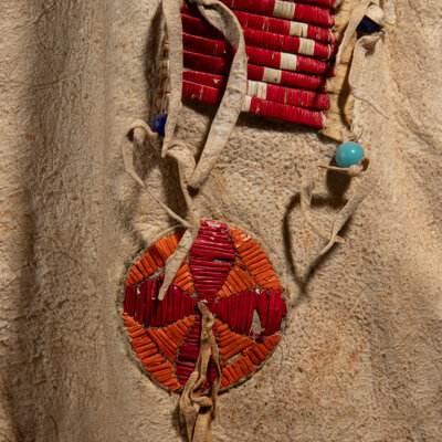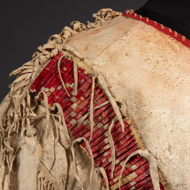 thread and sinew-sewn; quilled rawhide slats on shoulders in red and white; ermine drops; remnants of red pigment on inside collar