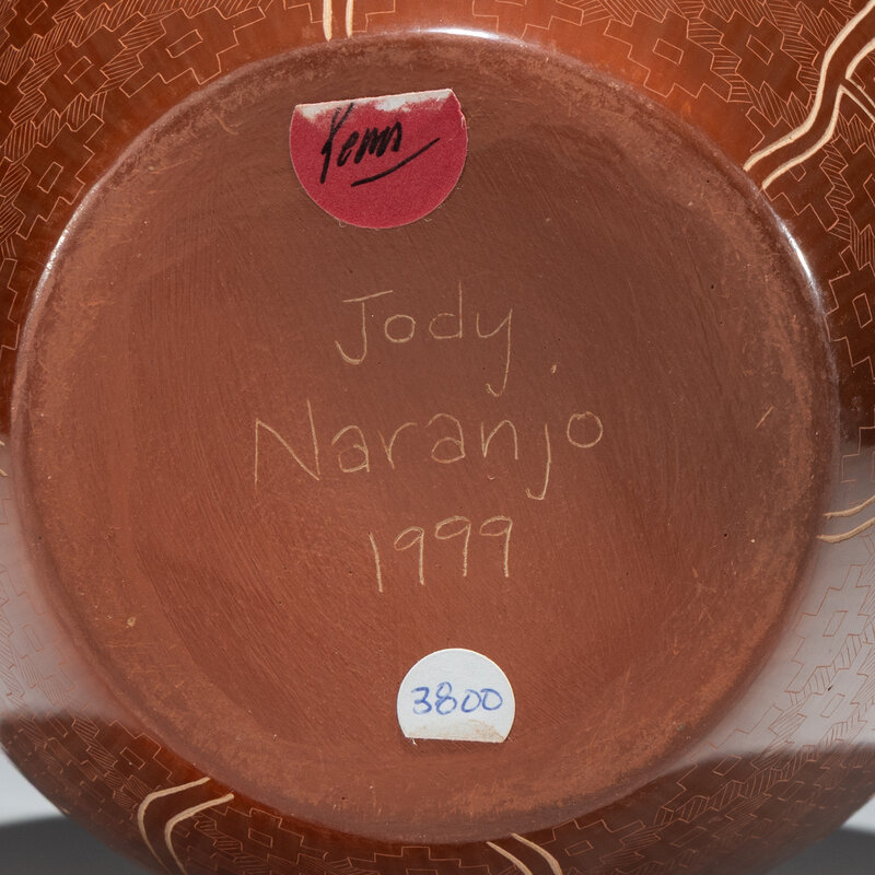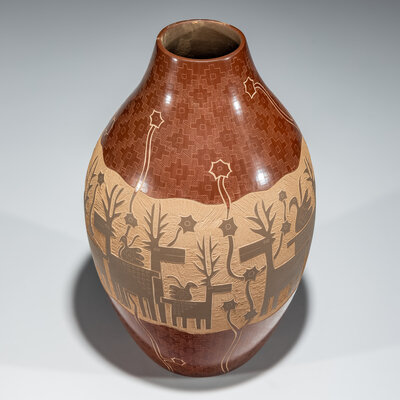 Redware Pottery Jar, with Sgraffito Deer and Parrots, 1999