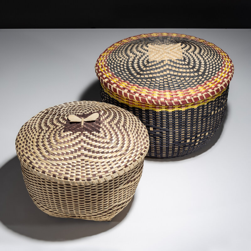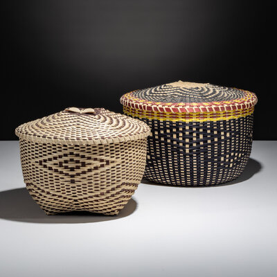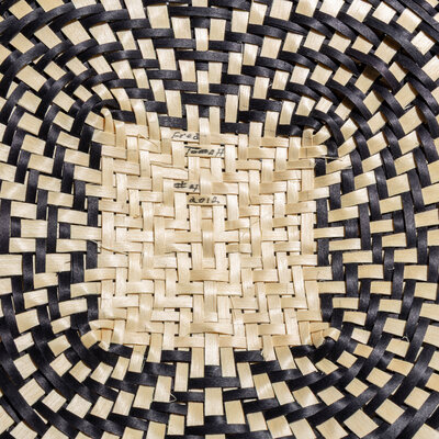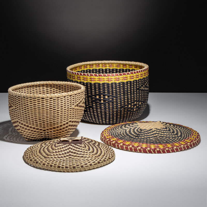 colorfully woven in natural and dyed black, red, and yellow; height 8-3/4 inches x diameter 12-1/2 inches