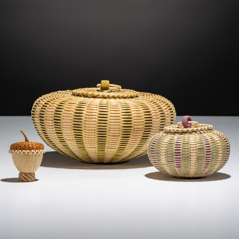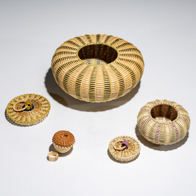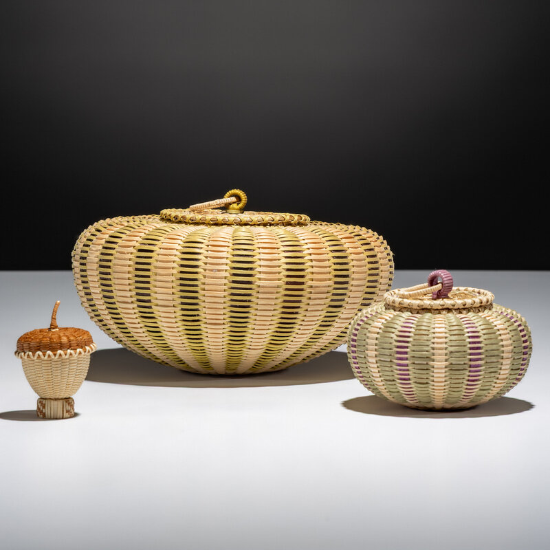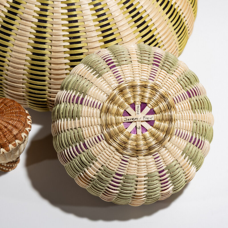 a mid-sized example, woven in natural, green, and purple; signed and dated 6-2010 on base; height 3-1/8 inches x diameter 4 inches