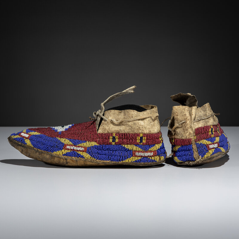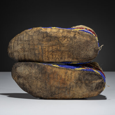 thread and sinew-sewn; beaded using colors of red white-heart, dark blue, greasy yellow, and white; stepped diamond on vamps