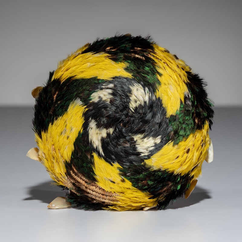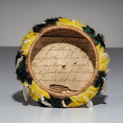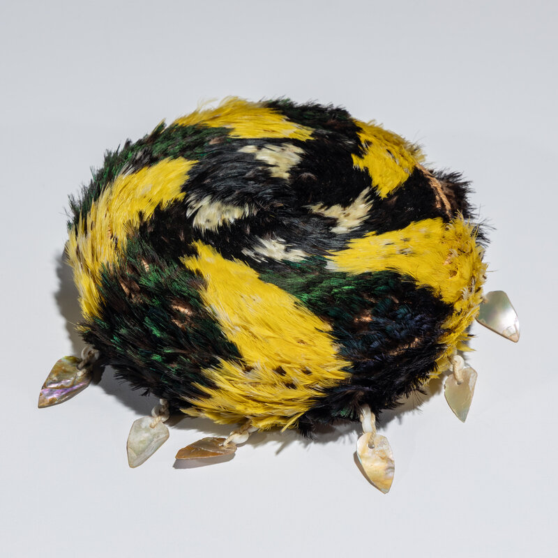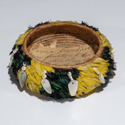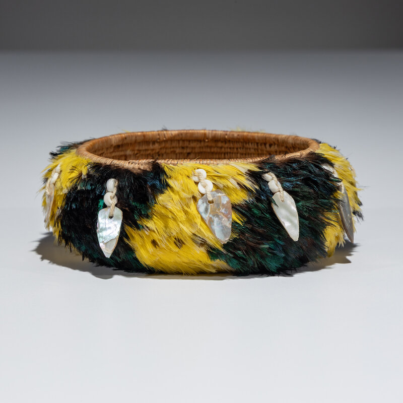 colorfully decorated and further adorned with abalone pendants suspended from the rim