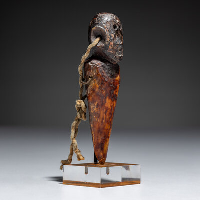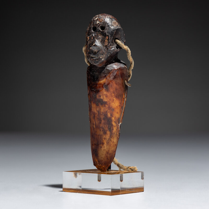 carved of fossilized walrus, in human form; pierced through for attachment