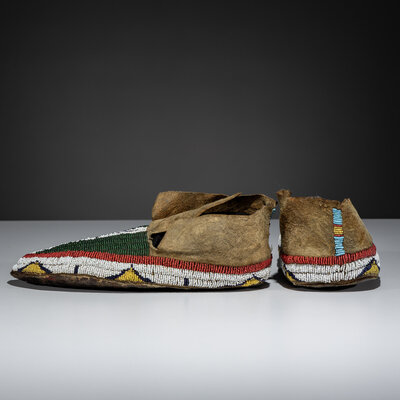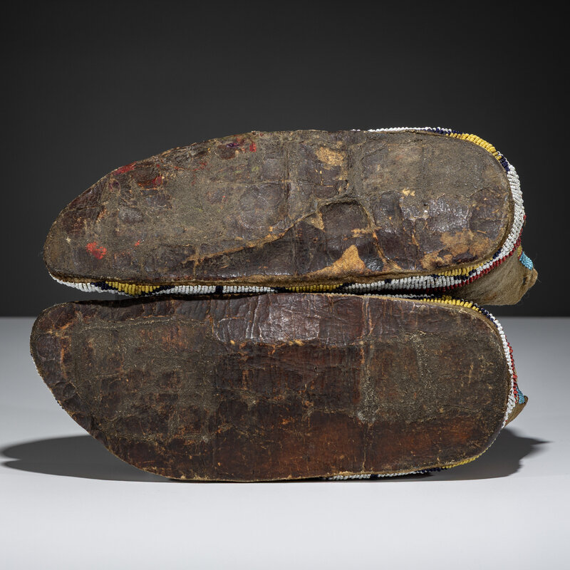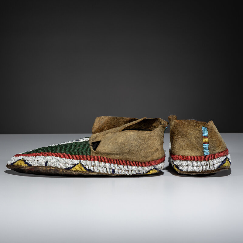sinew-sewn and beaded using colors of red white-heart, translucent green, cobalt, white, and greasy yellow