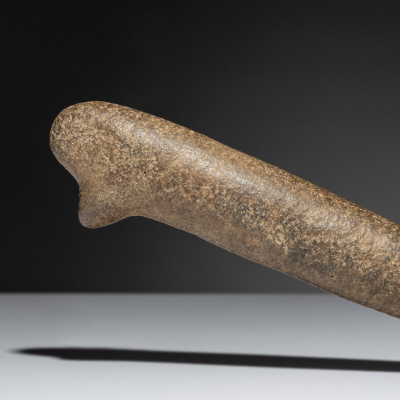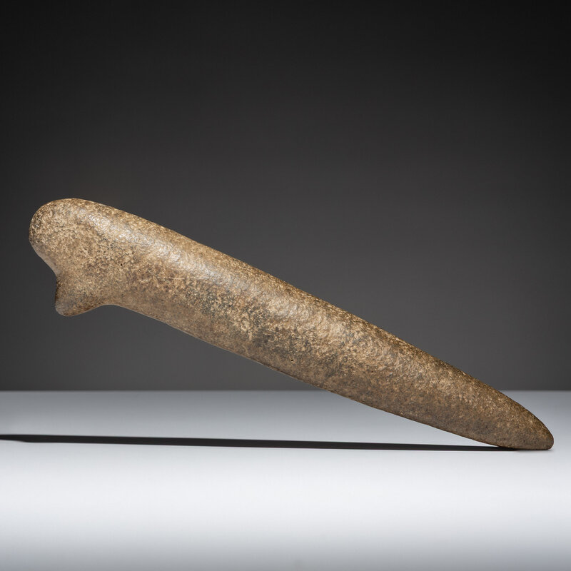 carved with a small protrusion on one end, tapering to a point on the opposite end