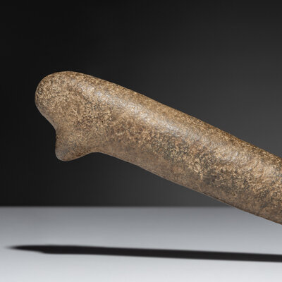 Weapons [such as this example] were mainly those suited to close combat and the Nootka manufactured a specialized form of short, straight club cut from dense-grained whalebone (1558-60, pl 193). These are beautifully balanced weapons and probably of great antiquity, several similar specimens having been collected on the voyages of Cook and Vancouver (Gunther, 1972:209-11). An equally ancient form of Nootkan weapon was cut and ground from basalt in the form of a short hand club, one end serving as a crusher, the other end as a penetrator. Fine clubs made of antler, larger but similar in shape to the shaman’s baton, no. 1461, pl. 181, were prized possessions and several stone axes, set in wood handles carved as heads, were collected from the Nootka on Cook’s third voyage.