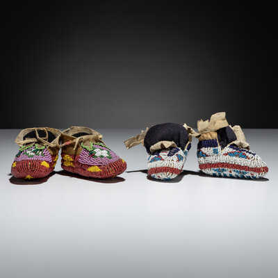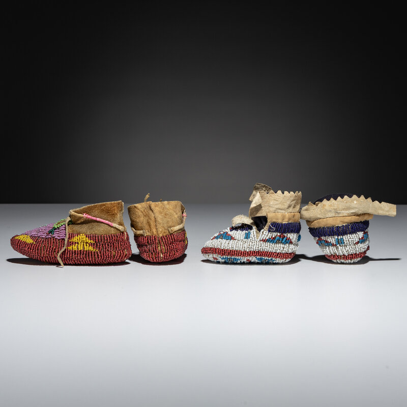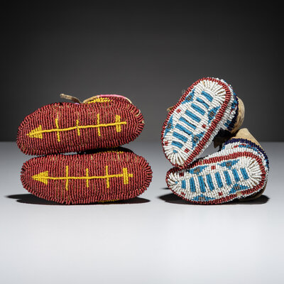 a Central Plains pair beaded with colors of red white-heart, pink, pea green, light green, and greasy yellow; quill-wrapped ties; tassels on split tongues, length 5 inches