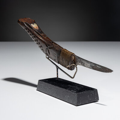 having an overall raptor talon form; chip-carved decorations on handle with inset mother-of-pearl heart; copper wire wrapping; heavily resharpened steel blade, length 8-1/4 inches