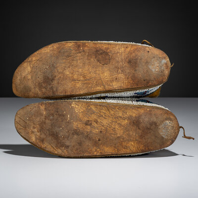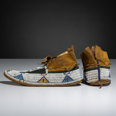 sinew-sewn; beaded with geometric elements, including a central Morning Star, in colors of red white-heart, translucent green, navy blue, sky blue, and greasy yellow and white; split and angled cuffs; yellow ochre