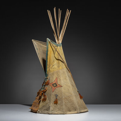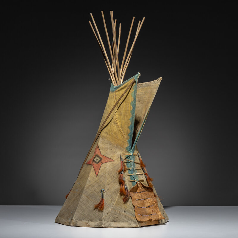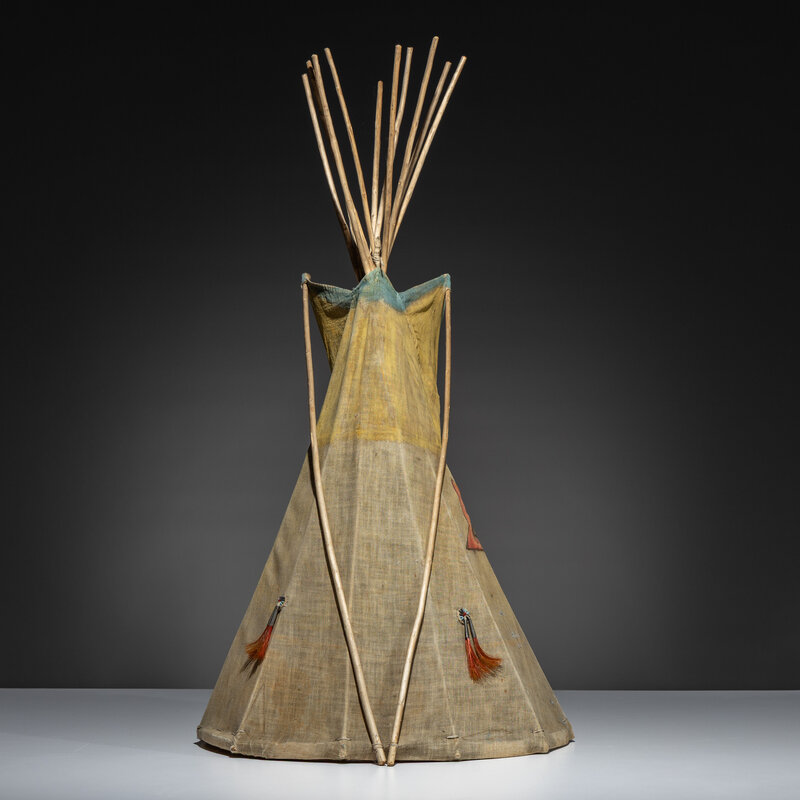 linen; stars painted in yellow, orange, and black; horsehair-filled tin cones; wood framework