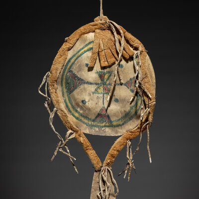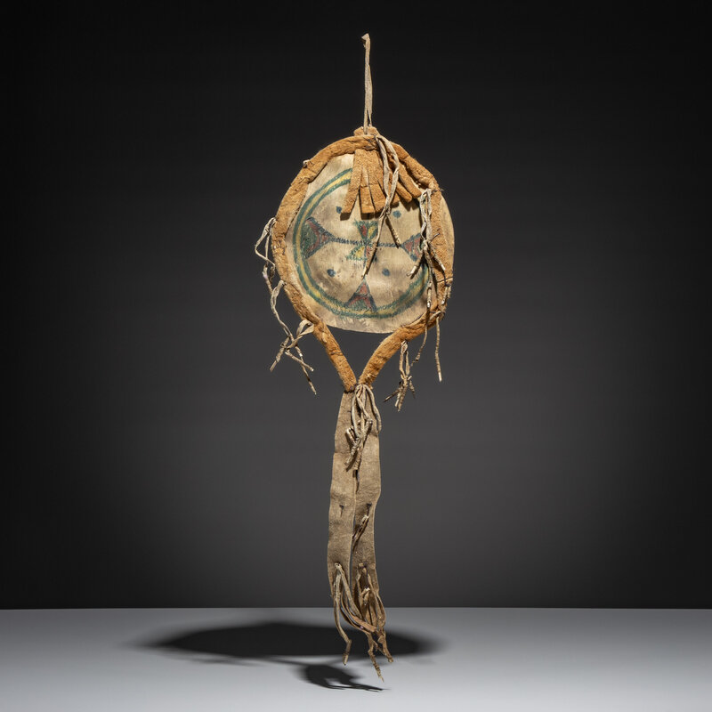 diminutive size; thin parfleche disk painted in blue, green, red, and yellow is surrounded by buffalo hide