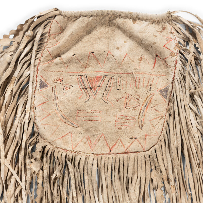 thread and sinew-sewn, softly-tanned elk hide; painted on one side with a variety of geometric designs; fringed sides, some with diamond cutouts