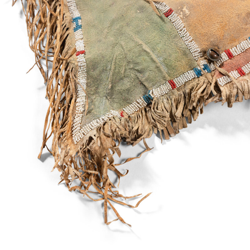 sinew-sewn and beaded in colors of greasy blue, apple red white-heart, and white; hide coated in orange, red, and green pigments