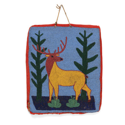 thread-sewn on canvas with a navy blue felt backing, edged with red wool trade cloth; beaded on the front with colors of red white-heart; yellow, translucent green, and navy blue against a periwinkle ground