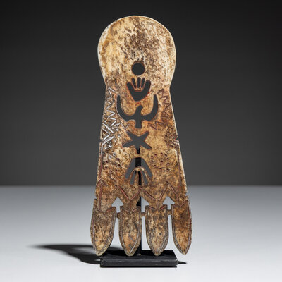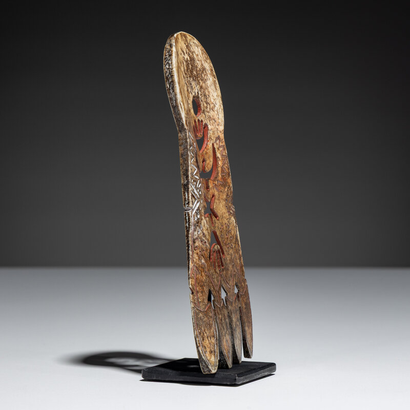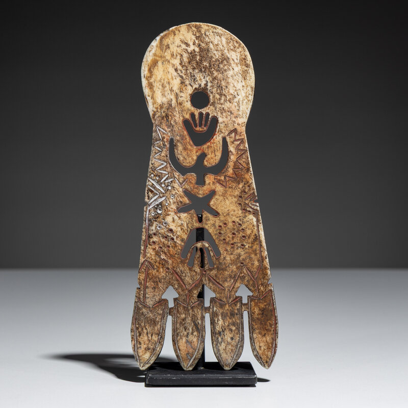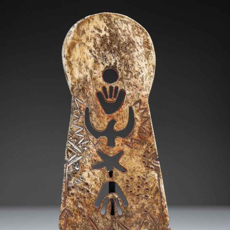 carved bone with cutout images of hands, thunderbird, and star; further detailed with geometric elements filled in with red pigment