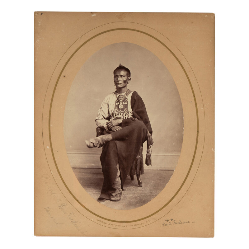 7 3/8 x 5 1/4 in. albumen photograph on original 10 x 8 in. cardstock mount with imprint of Addis Gallery, Washington, DC in lower margin. Penciled notations in different hands on mount recto and verso. Originally taken by Antonio Zeno Shindler in 1868 and printed ca 1868-1869 when Shindler was the proprietor and photographer at the Addis gallery.