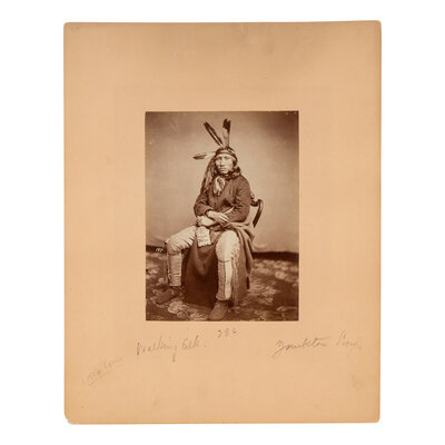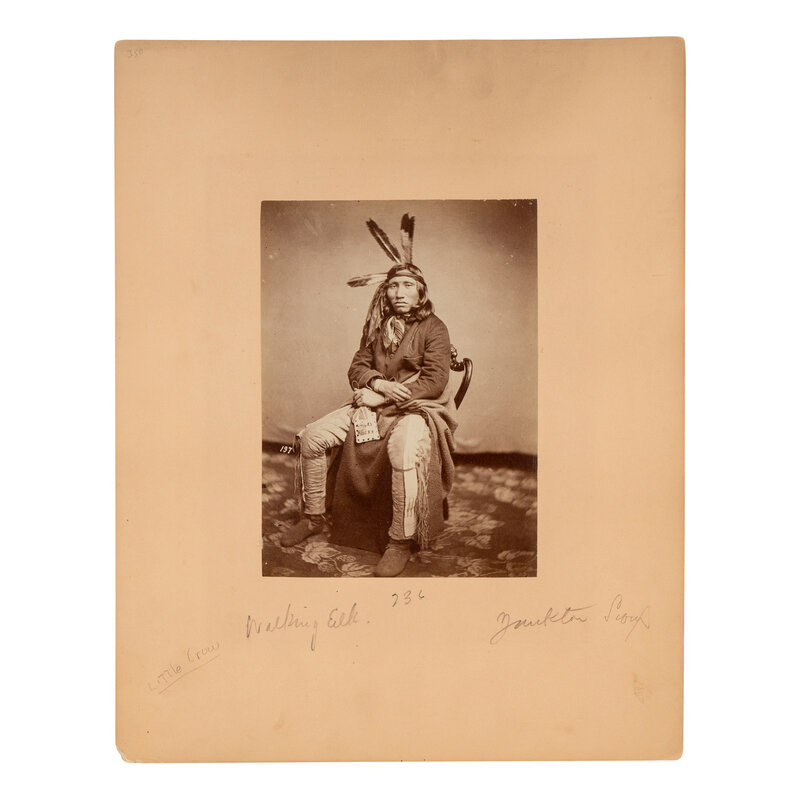 7 1/8 x 5 1/4 in. albumen photograph on 13 3/4 x 10 3/4 in. mount. Numbered 197 in the negative, with manuscript pencil identification, "Walking Elk. 236 Yankton Sioux." An important image of "A-ha-ka-ma-ni" taken by Julian Vannerson at the McClees Gallery in Washington, DC in 1857.