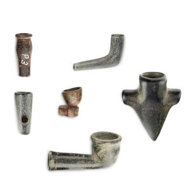 lot of 6 Cherokee / Creek style pipe bowls; three with collection labels