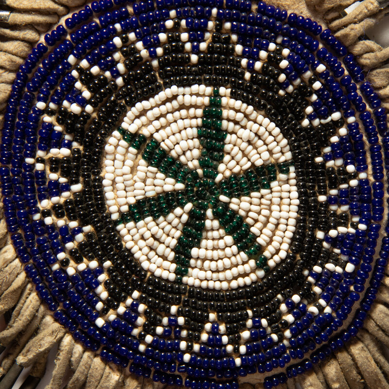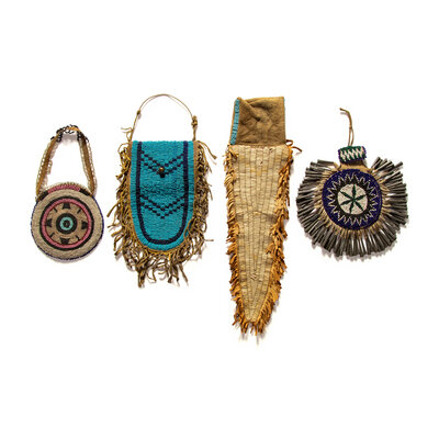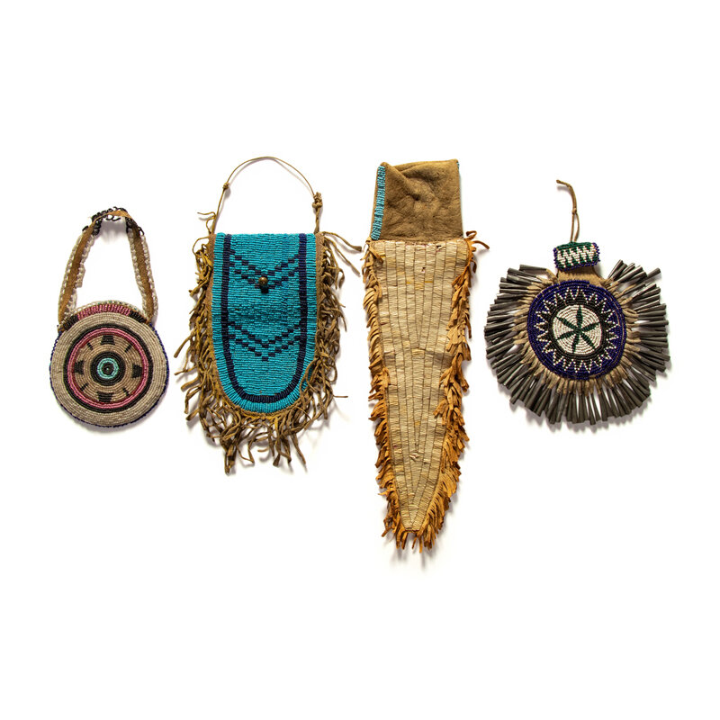 lastly. a small thread-sewn hide pouch, lined with a patterned cotton cloth and decorated with concentric beaded design; diameter 4-1/2 inches